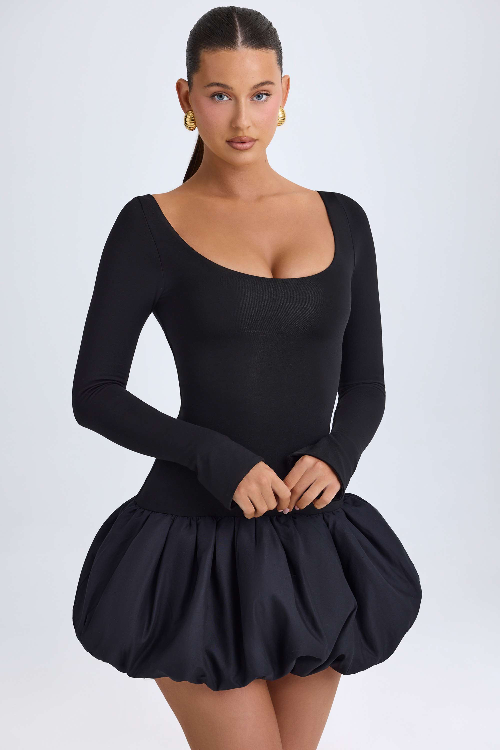 Timeless, elevated, undeniably chic. Perfect for dressy dinner plans or evening events, the Delphi mini dress is designed with a drop-waist stretch jersey bodice made with TENCEL™ Modal fibres, derived from controlled or certified wood sources, and falls to a voluminous bubble-hem skirt. It’s framed with a classic scoop neckline and fitted long sleeves for a timeless look.