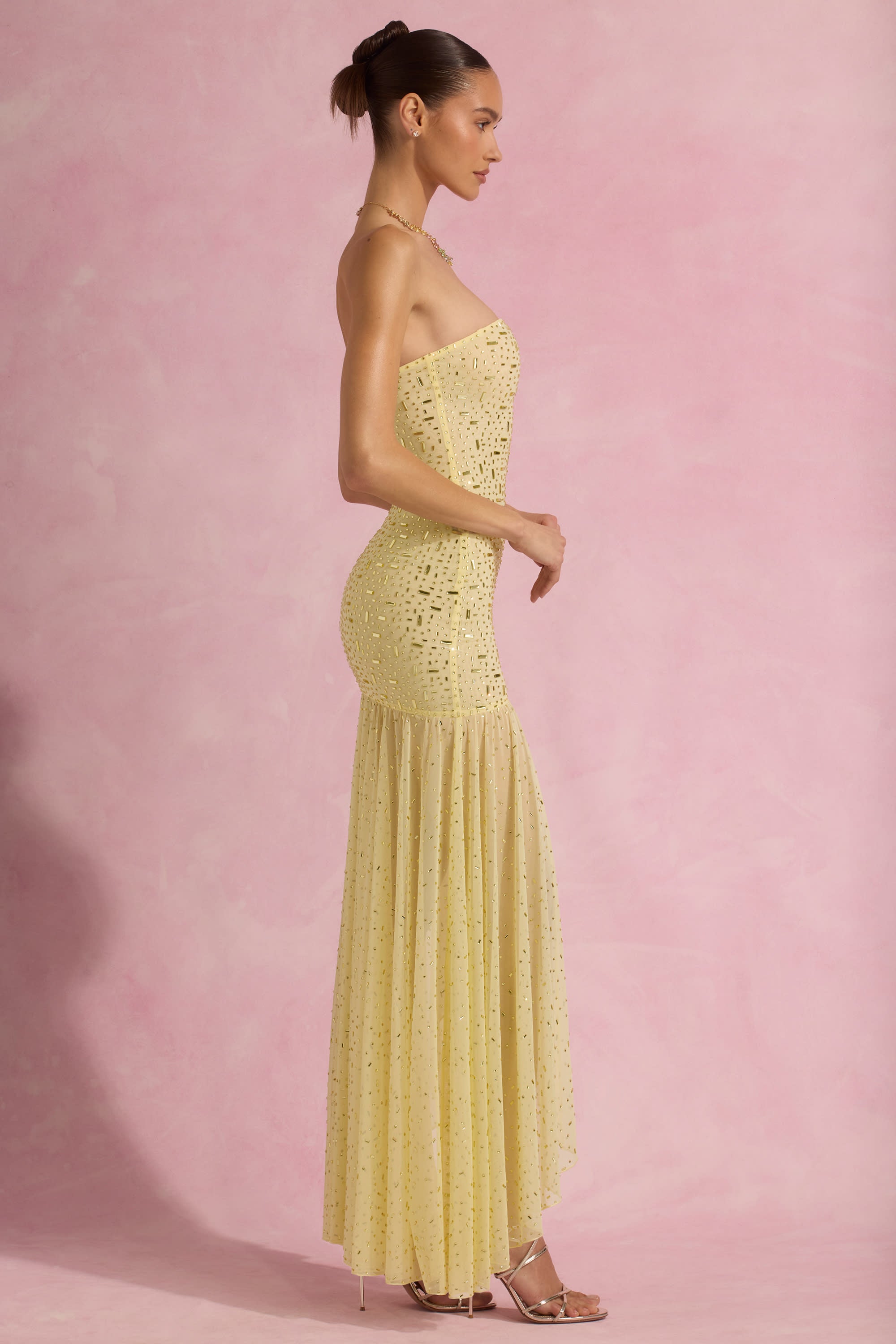 Made for milestone moments, the Kerra maxi dress is crafted from premium, dual-layered 20D stretch mesh with a figure-hugging bodice that enhances your natural curves and features a sheer asymmetric hem designed for dynamic movement with every step. It comes with detachable, adjustable straps and is fully embellished with our signature HOTFIX crystals for sparkle you’ll have to see to believe.