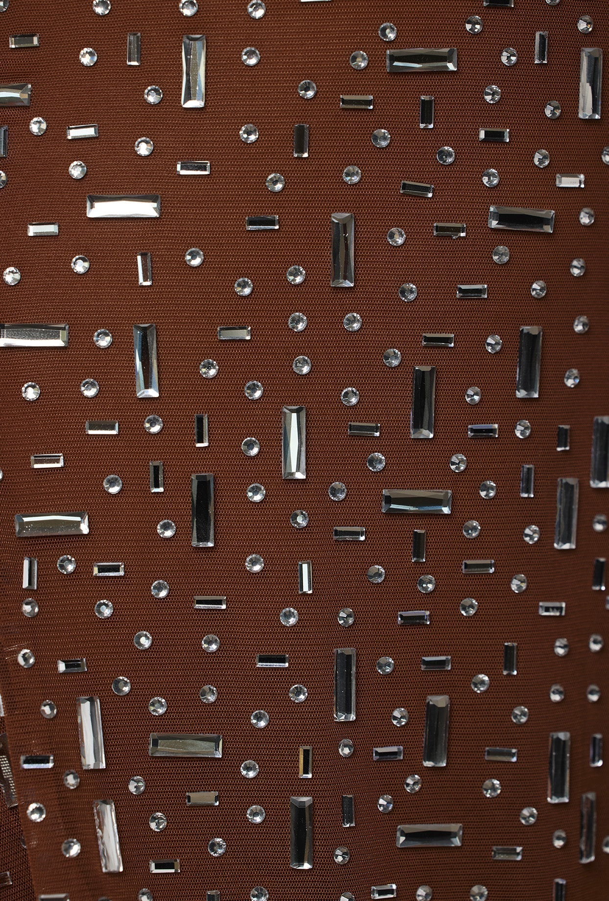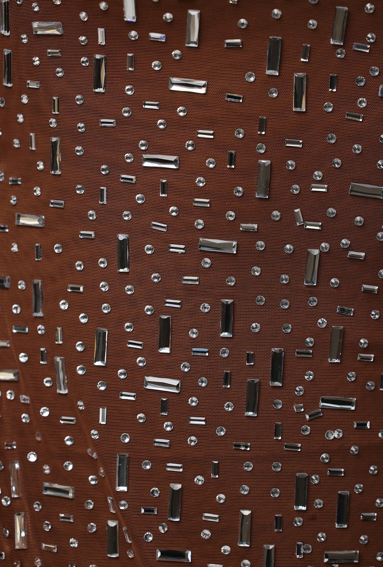 Sheer Embellished Scoop Neck Mini Dress in Mocha