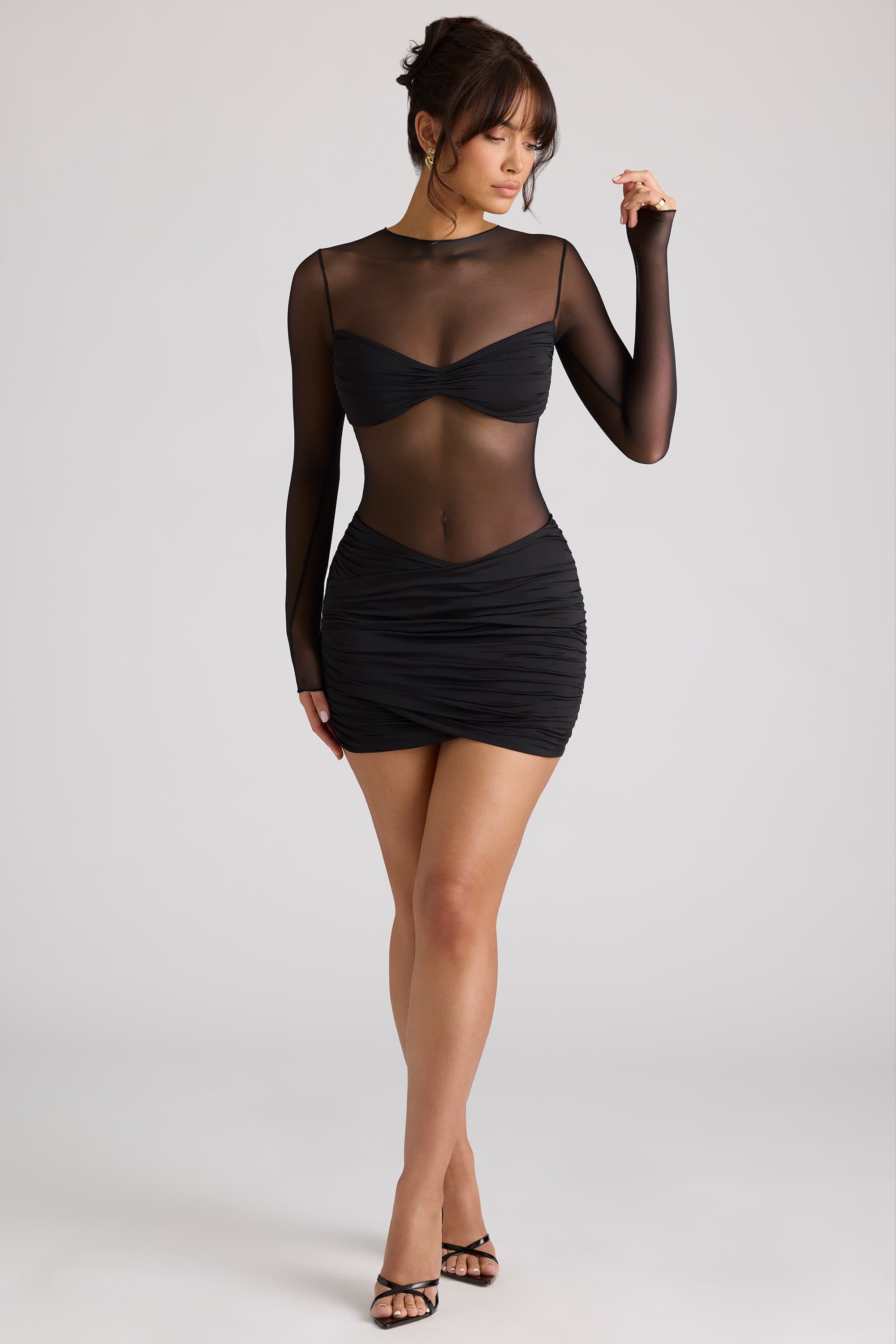 Introducing the Essie mini dress. Designed in our body-hugging slinky jersey fabric with sheer mesh panelling throughout the body, Essie features a slinky jersey panel at the bust and a body contouring design complete with a high neckline, long tight-cut sleeves, and a ruched skirt.