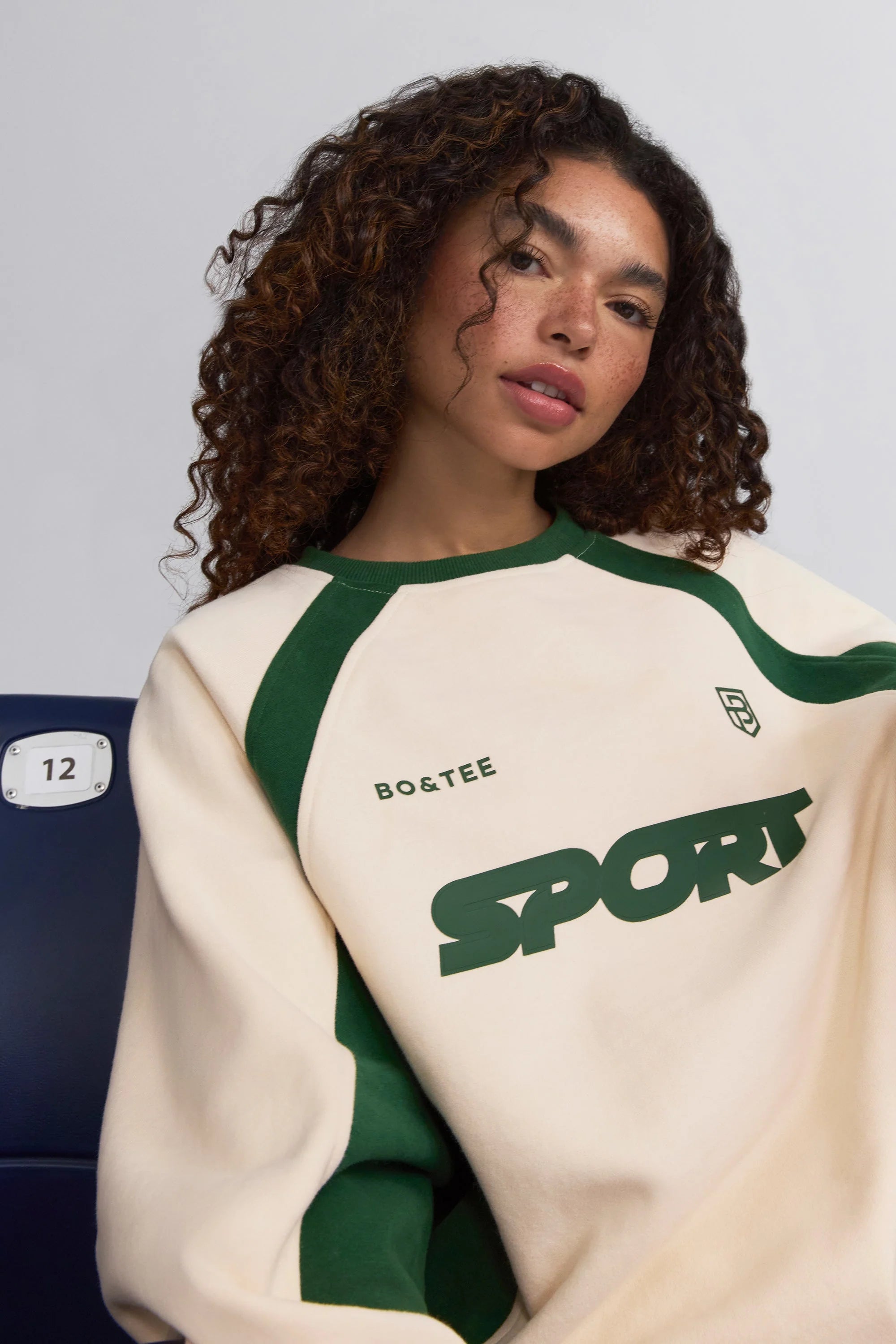 A nod to classic sportswear. Uplifted with contrasting colourblock panels, this sweatshirt is crafted from cosy brushed-back fleece to an oversized silhouette tempered with a ribbed hem and cuffs. It’s framed with a classic crew neck and finished with sporty graphics, including an embroidered Bo&Tee crest logo at the chest.