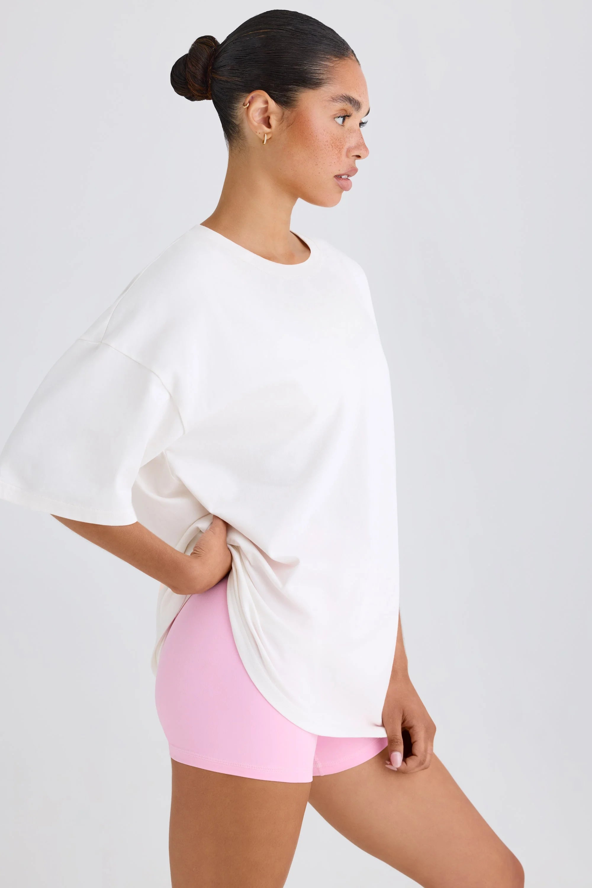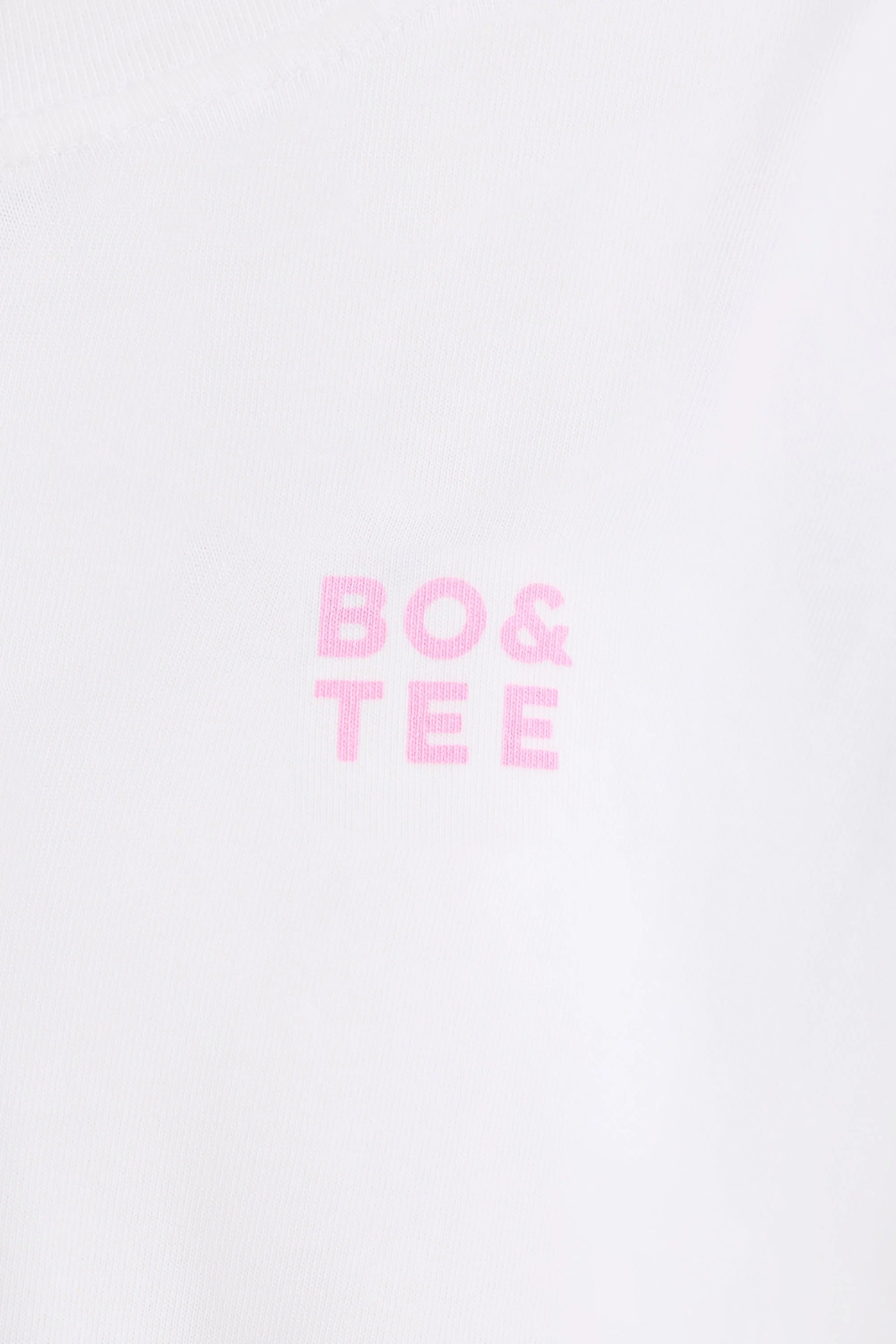 Summer layers. The perfect throw-on piece, this T-shirt is crafted from super soft cotton jersey with a touch of stretch for enhanced comfort. The oversized fit is enhanced thanks to the dropped shoulders and it’s framed with a classic crew neck. It’s finished with a contrasting printed Bo&Tee logo at the chest and a playful graphic slogan at the back.