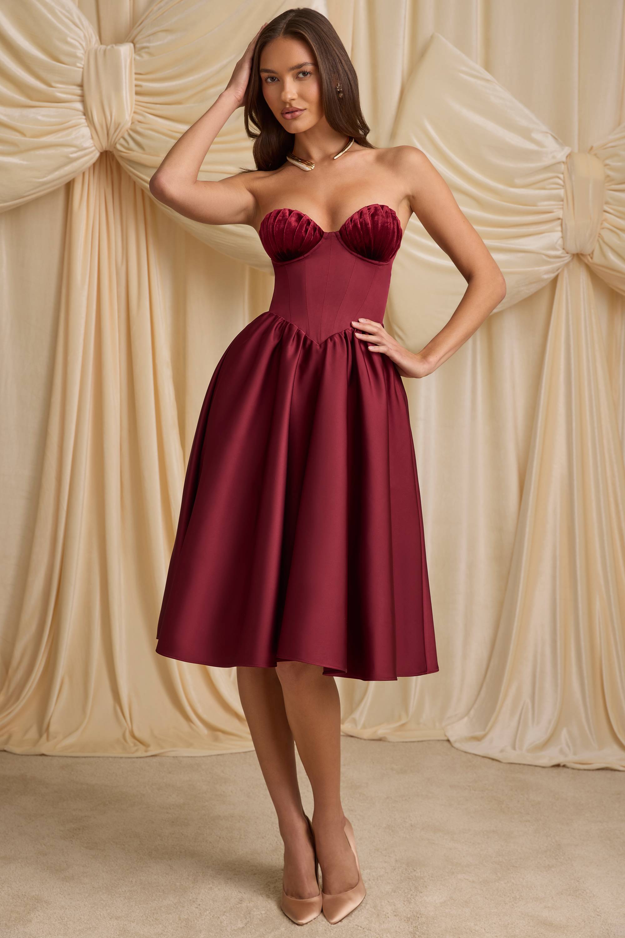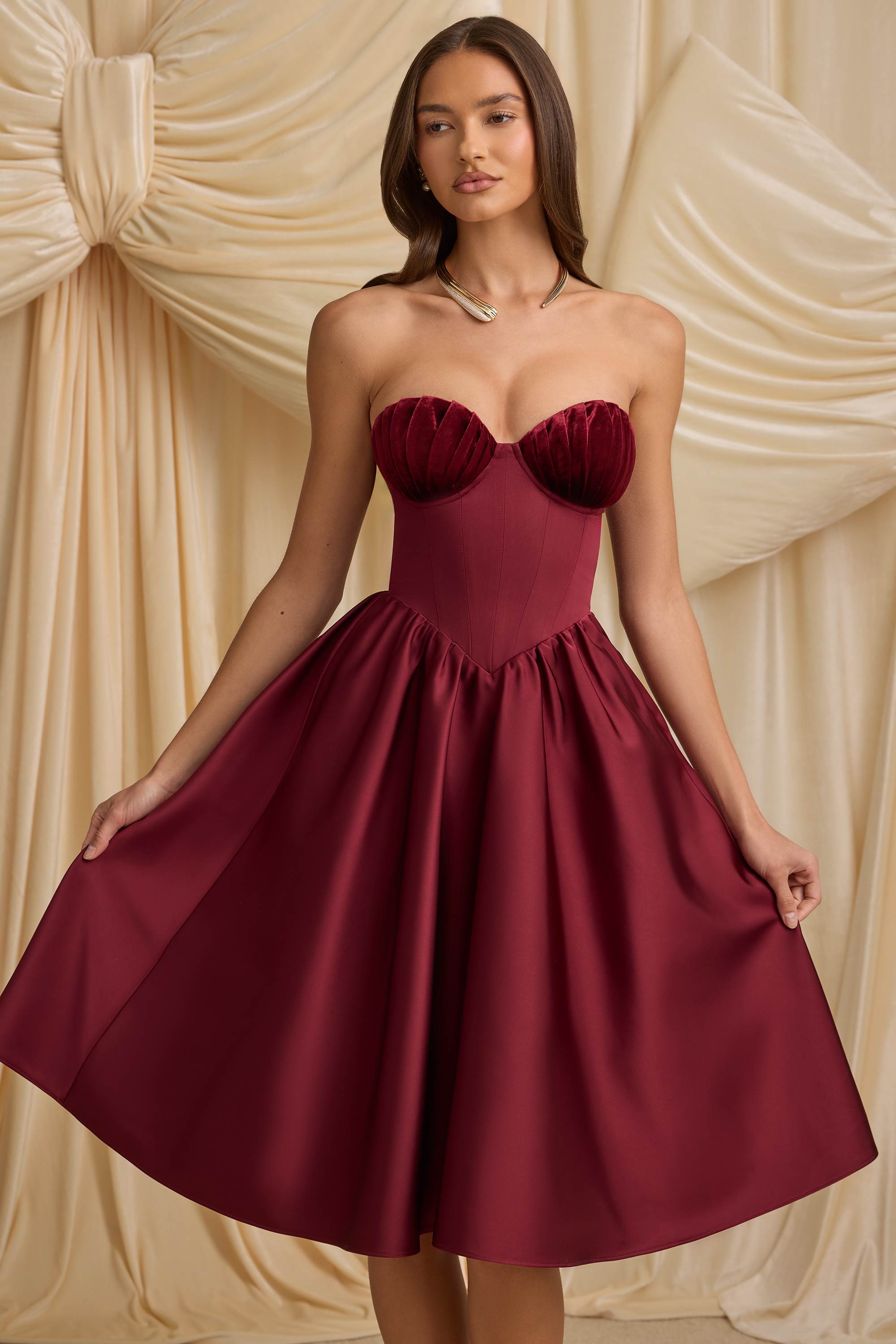 Channel classic glamour with our Gabrielle midi dress. Available in two enduring hues, it’s made from premium, non-stretch bonded satin with a built-in corset bodice for enhanced support and a gathered full skirt that creates a stunning silhouette. It’s elevated with pleated wired cups and a signature lace-up back that can be adjusted for your perfect fit.