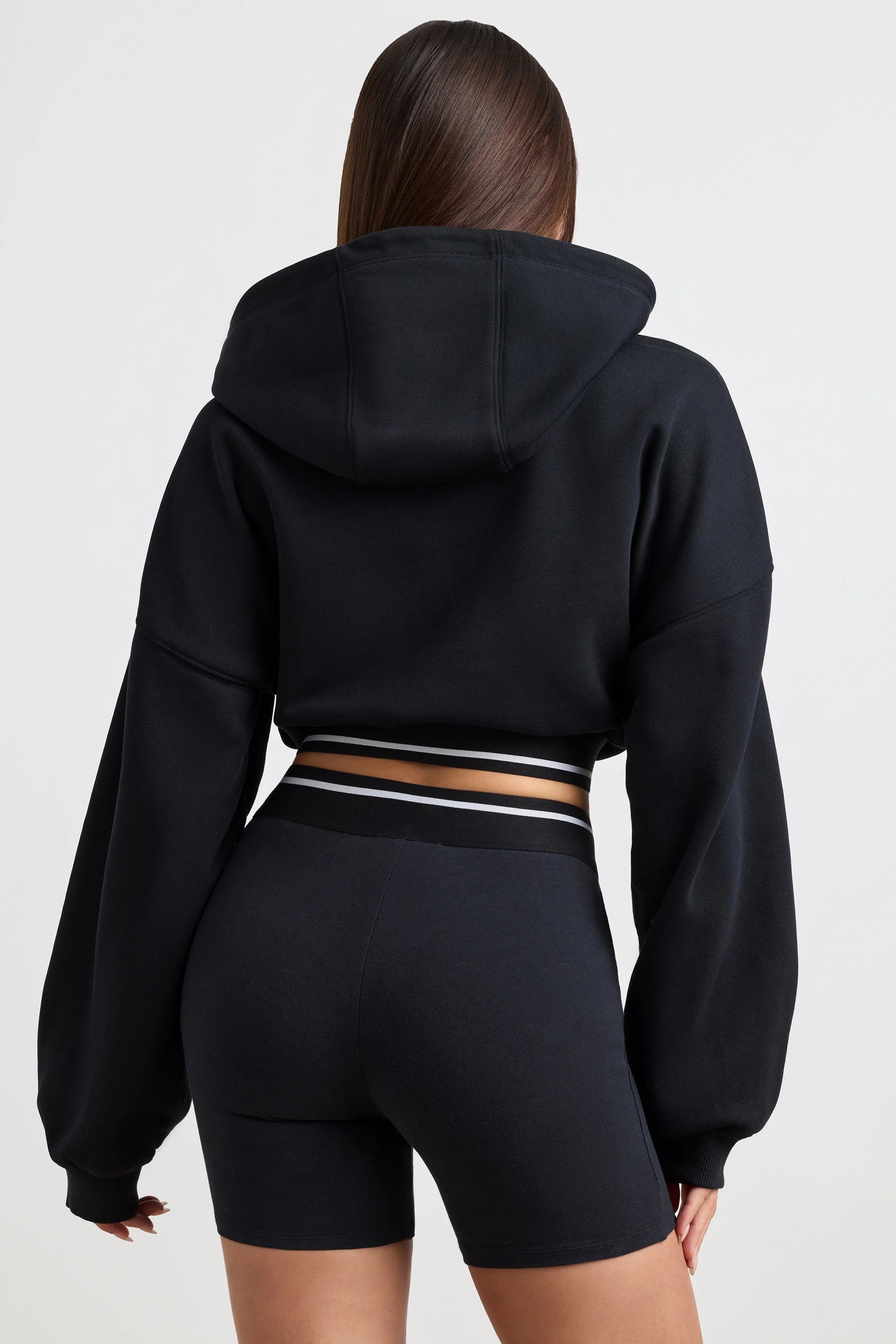Stretch Cotton Fleece Cropped Hoodie in Black
