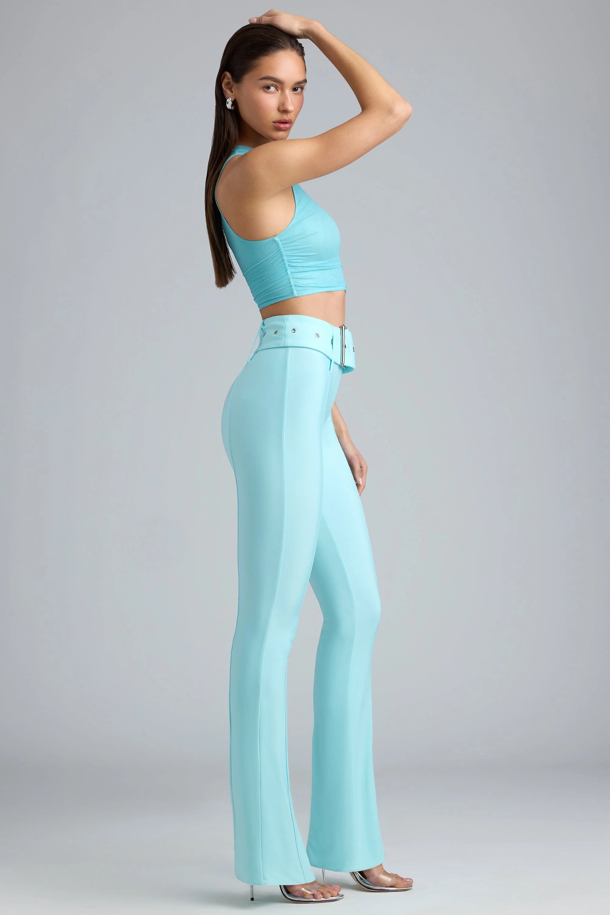 Tall Metallic Belted Mid-Rise Flared Trousers in Ice Blue