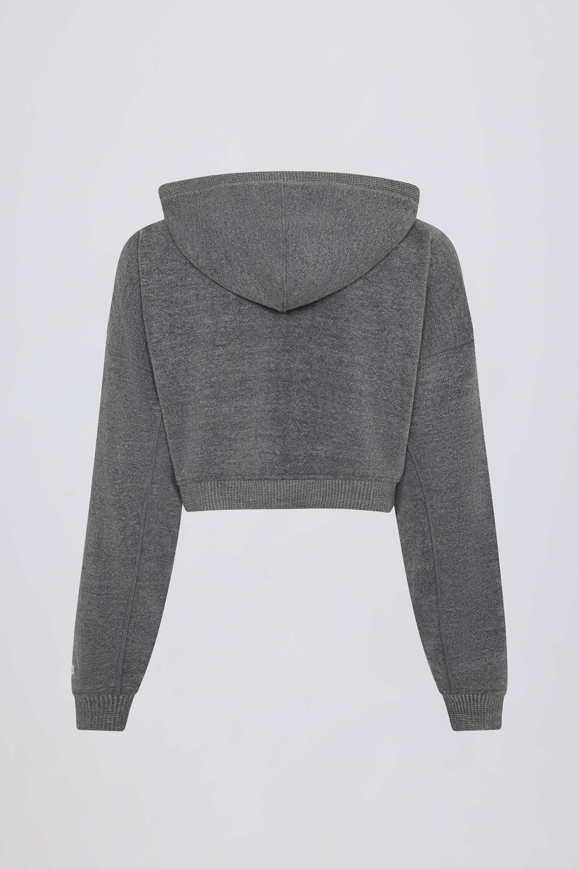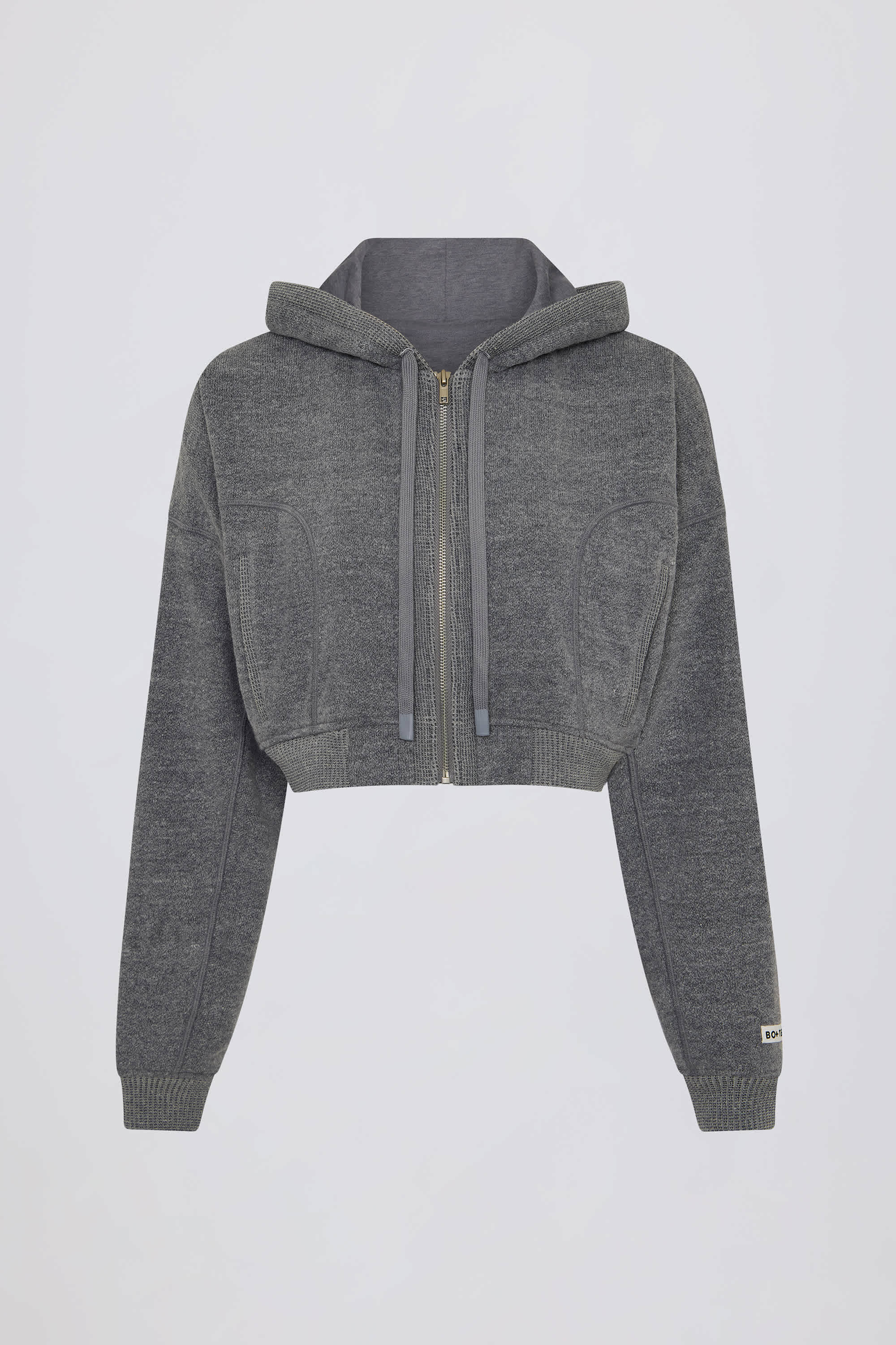 Terry Cotton Zip-Up Cropped Hoodie in Dark Grey