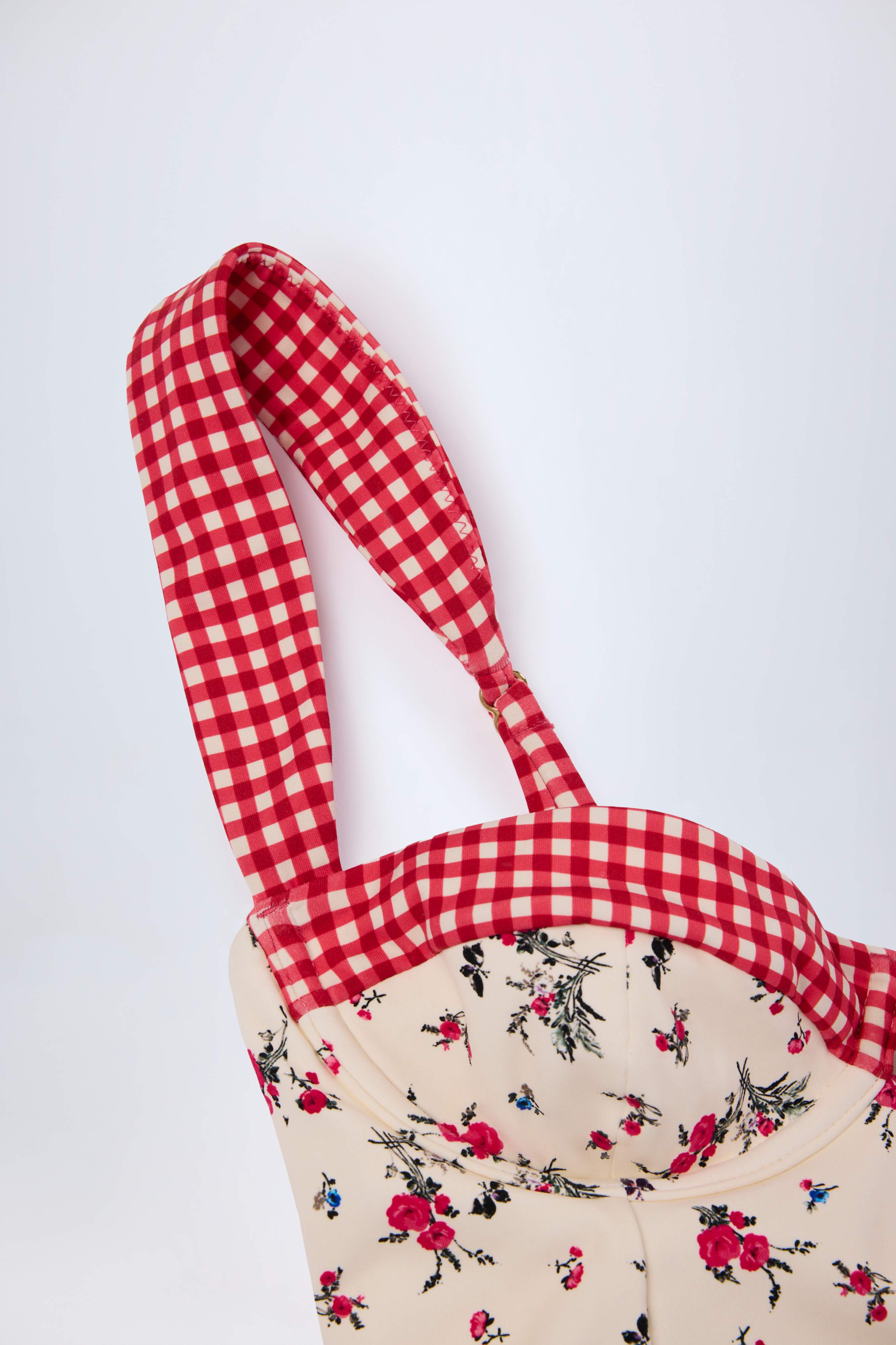 Modern pin-up. Inspired by classic styles, the Isona swimsuit is crafted from our premium stretch-jersey swim fabric to a figure-flattering silhouette with supportive balconette cups. Cut to a high-cut silhouette, it’s framed with tapered contrasting straps and printed with contrasting checks and florals you’ll love.