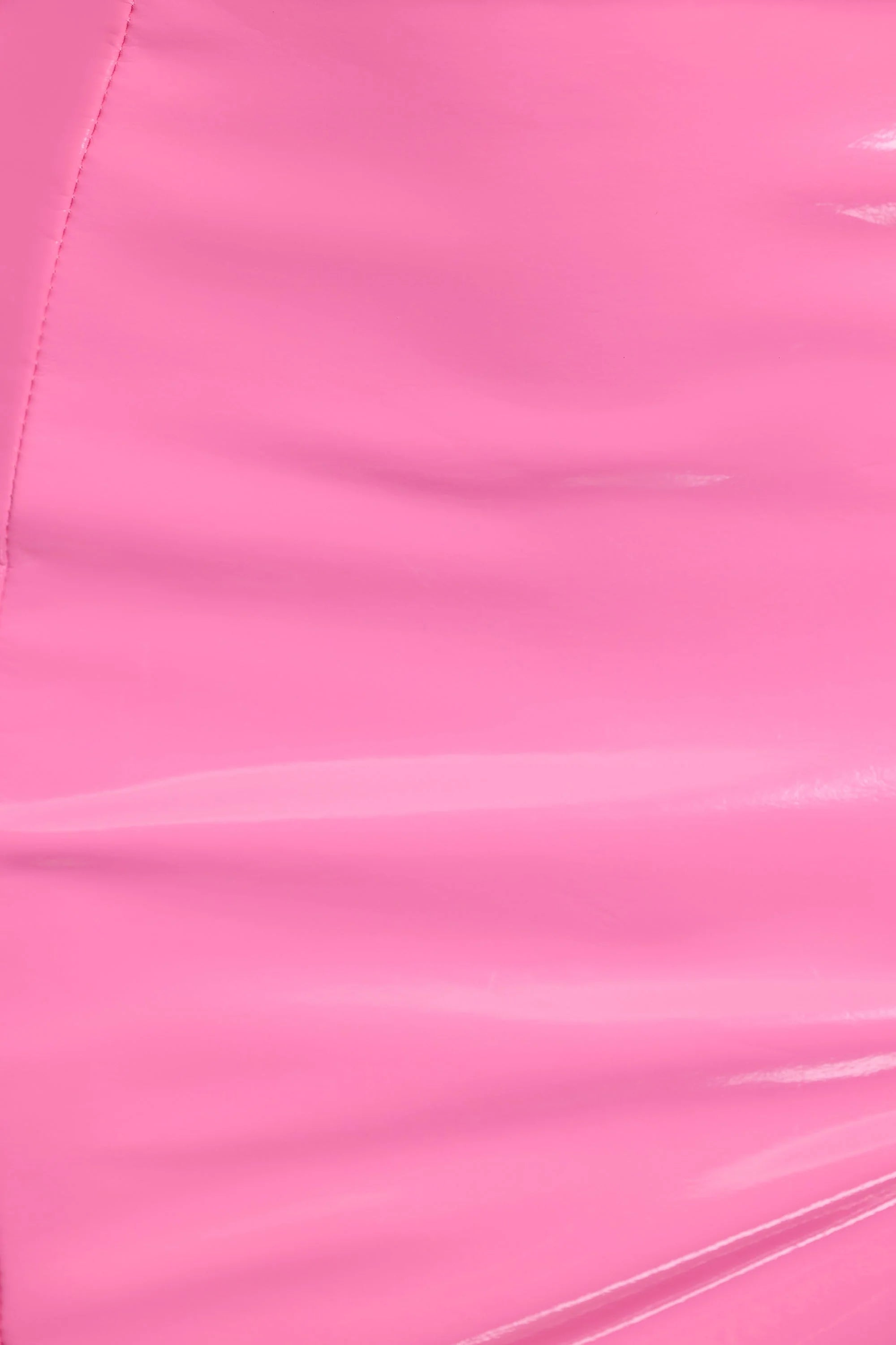 High shine, light vinyl fabric (Shell: 50% Polyurethane, 45% Polyester, 5% Elastane, Lining: 90% Polyester, 10% Elastane). Fully lined. Please read the wash instructions.