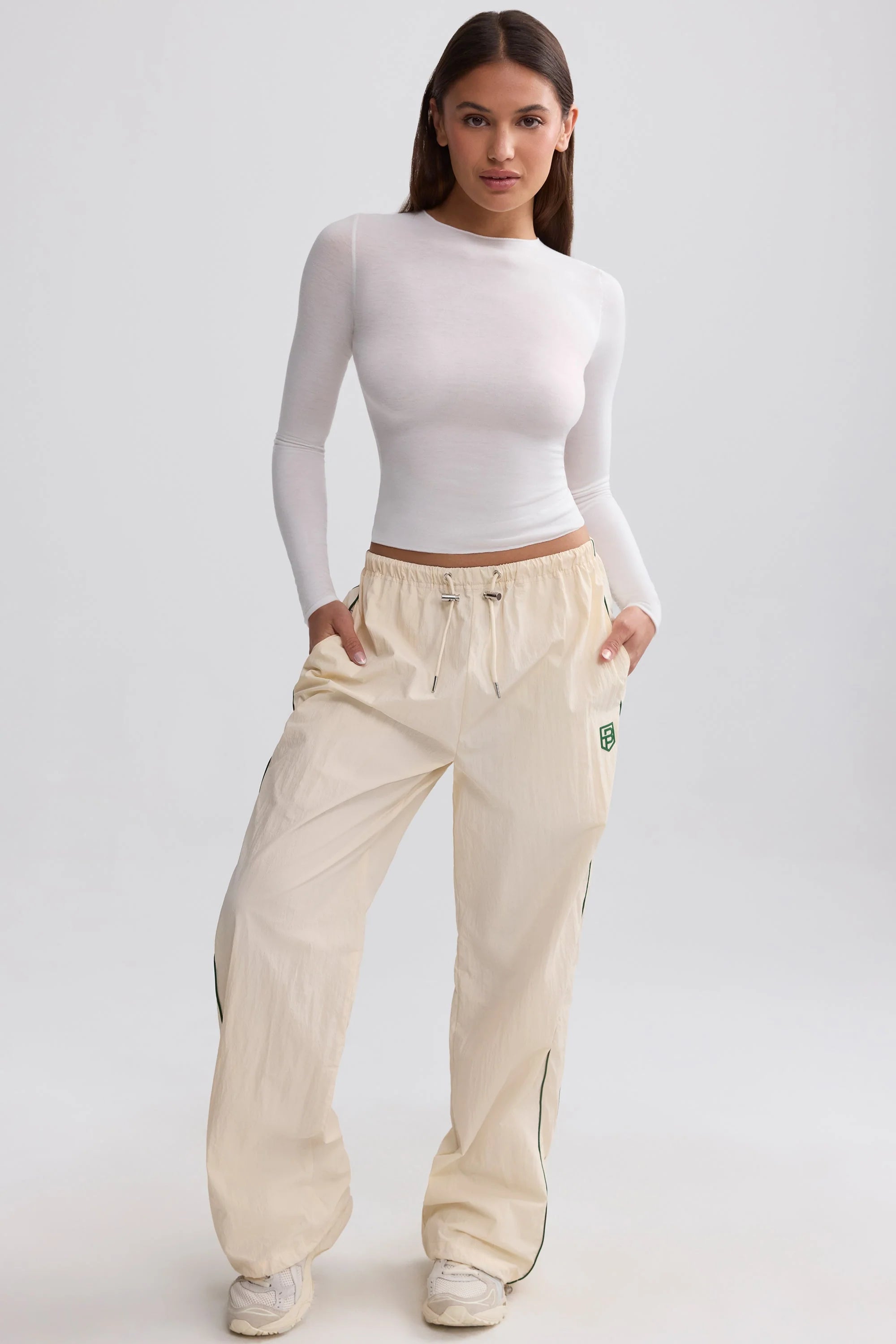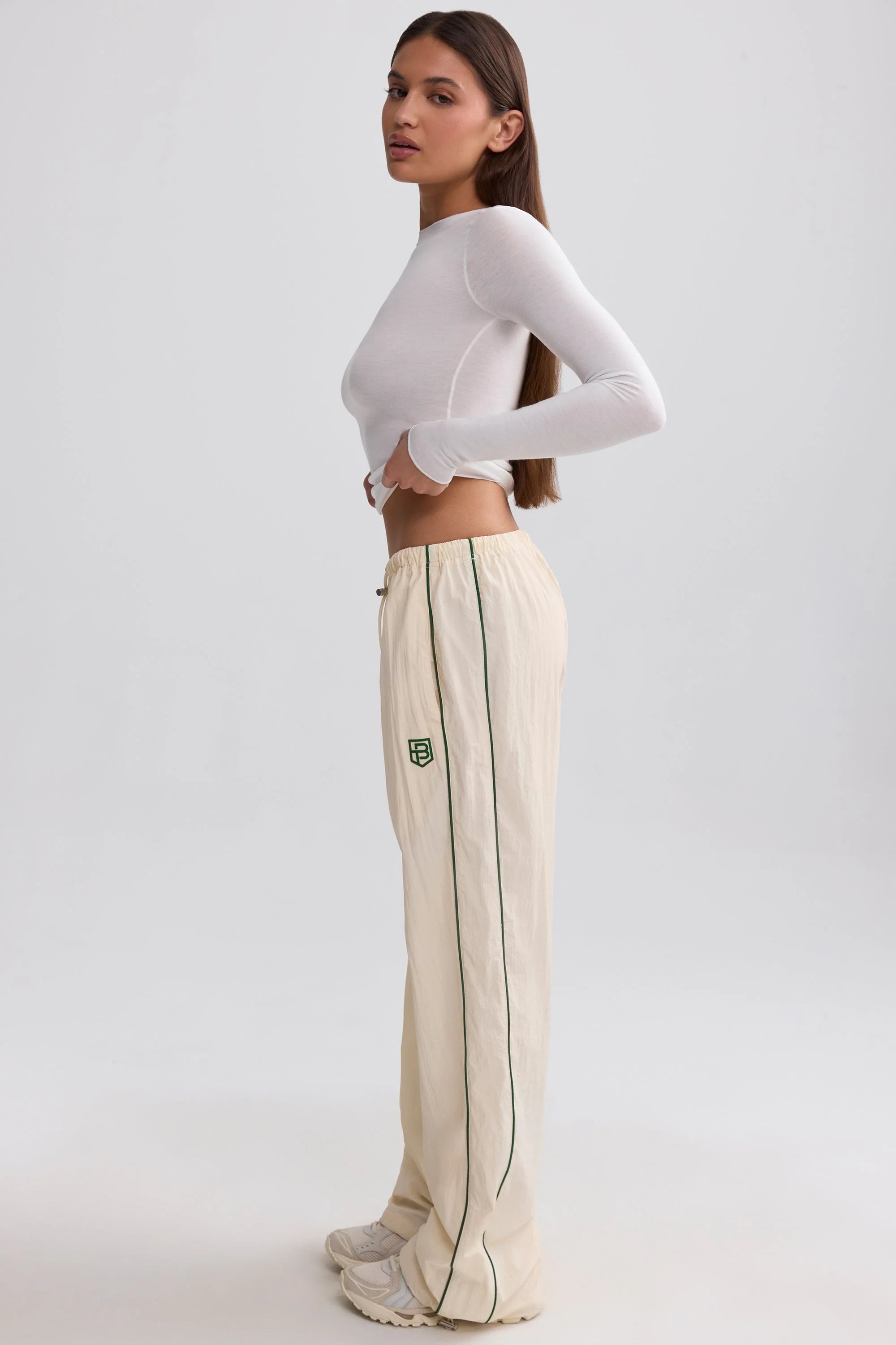 Game-changing separates. Designed for transitional styling, these lightly crinkled track pants are crafted from lightweight and water-repellent nylon to an oversized wide-leg silhouette. Theyโre set on an elasticated drawstring waistband for a custom fit and feature two practical side pockets. The elasticated hems and contrast piping detail at each side cement the sporty inspiration.